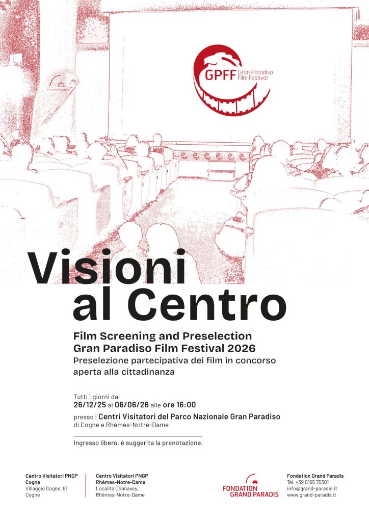 L’iniziativa “Visioni al Centro – Film Screening and Preselection Gran Paradiso Film Festival 2026” prevede un calendario di appuntamenti pubblici di visione e valutazione dei film naturalistici, ospitati presso i Centri Visitatori del Parco Nazionale Gran Paradiso di Cogne e di Rhêmes-Notre-Dame, che permetteranno a tutti gli appassionati di cinema di partecipare fin da subito alla creazione del prossimo GPFF e daranno modo alla Commissione di selezione di raccogliere valutazioni utili a rendere più efficiente e condiviso il processo di scelta delle opere in concorso. “Visioni al Centro” intende inoltre aprire ulteriormente i Centri Visitatori alla cittadinanza, favorendone la fruizione anche nel periodo invernale.